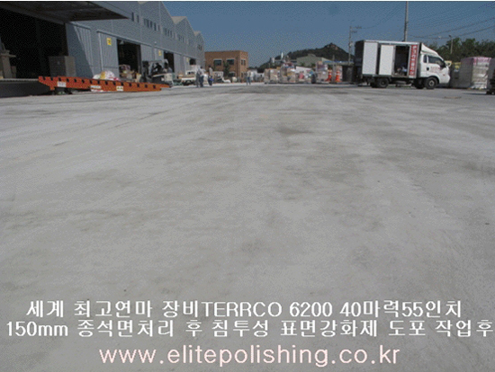 현장바닥상태가 동해를 입어 종석이 노출되고 콘크리트 비산먼지가 발생하고 잦은 대형차량 통행으로 15MM~20MM 종석이 노출된 현장을 테라코 6200 40마력 55인치의 장비를 투입하여 메탈#30, #50, #100 세라믹패드 #50, #100의 5단계 면처리작업후 침투성표면강화제를 도포하여 바닥의 문제점을 해결하였습니다